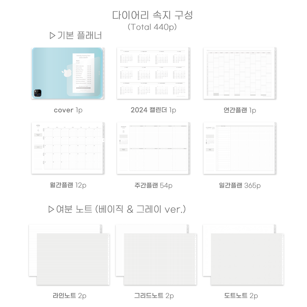 딱 필요한 속지들로만 구성하여 담백한 느낌으로 디자인 하였어요.