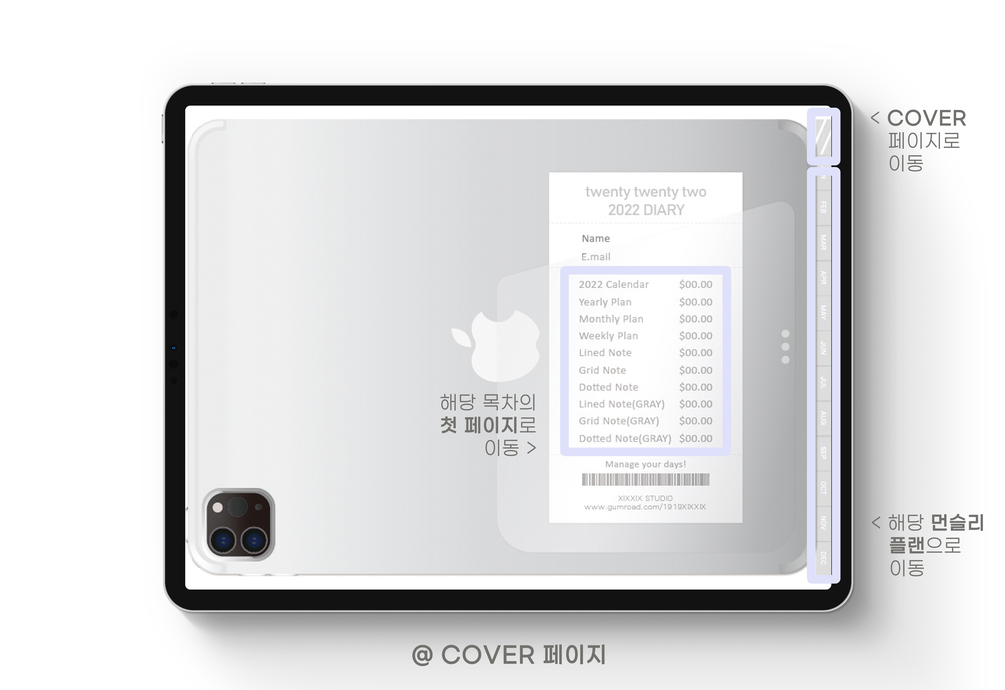 아이패드 후면부로 디자인한 사과 표지의 다이어리에요.